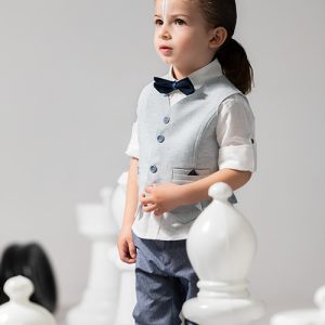 Trois-pièces με μπλε κοτλέ χιλιόριγο γιλέκο, εκρού πουκάμισο και ανοιχτό ταμπά παντελόνι με μπλε λεπτομέρειες. Συνοδεύεται από μπλε πουά παπιγιόν…